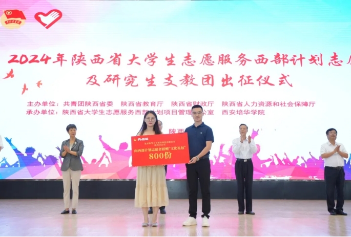出征仪式上,与会领导为2024年新招募在陕服务西部计划志愿者赠送出征装备,为2024年陕西省大学生志愿服务西部计划陕西服务总队和各市、县(区)服务分队授旗;北京粉笔蓝天科技有限公司陕西分公司为在陕服务西部计划志愿者捐赠“文化大礼包”;全体西部计划志愿者庄严宣誓,集体发出了“清澈的爱,只为中国”的青春誓言。