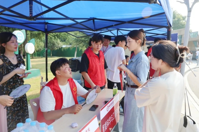 大批的志愿者,帮新生一起扛行李、提供咨询服务,陪同办理报到手续,还有摆渡车全天侯为学子提供服务。