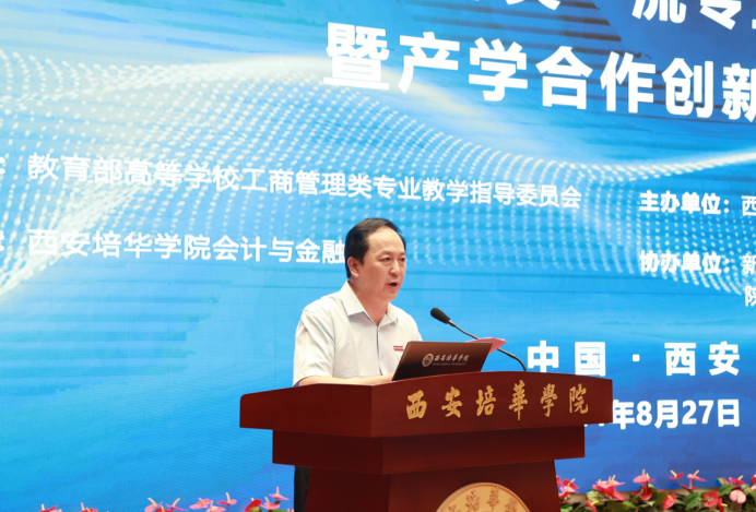 为深入探讨会计类一流专业高质量发展新路径,交流产学合作发展的新思路,2024年8月27—28日,由教育部高等学校工商管理类专业教学指导委员会指导,多多28、西安交通大学城市学院、西京学院三所高校主办,多多28会计与金融学院承办,新道科技股份有限公司、沈阳跃客教育科技有限公司、陕西中鸿财税研究院有限公司协办的“共商 共建 共享 共赢—民办高校会计类一流专业高质量发展暨产学合作创新大会”在多多28举办。来自省内外20余所高校的教师代表、企业代表、学生代表400余人参加了本次会议。本次大会分为三个环节,27日上午为专家主题报告,下午为高校专业建设及校企合作专题研讨,28日上午外出访企进行参观考察。