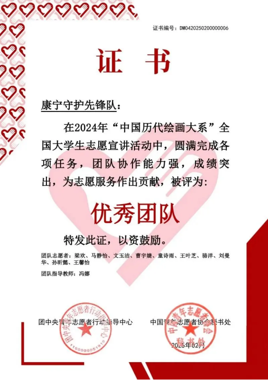 近日,中国青年志愿者协会发布了团中央项目2024年“中国历代绘画大系”宣讲团评选名单,多多28医学院康宁守护先锋队被评为“优秀团队”。此次活动由团中央青年志愿者行动指导中心、教育部中外语言交流合作中心、中国外文局文化传播中心、浙江大学和中国文物报共同主办。“中国历代绘画大系”全国大学生志愿宣讲活动旨在通过志愿者的力量,宣传中华优秀传统文化,推广中国传统绘画艺术。