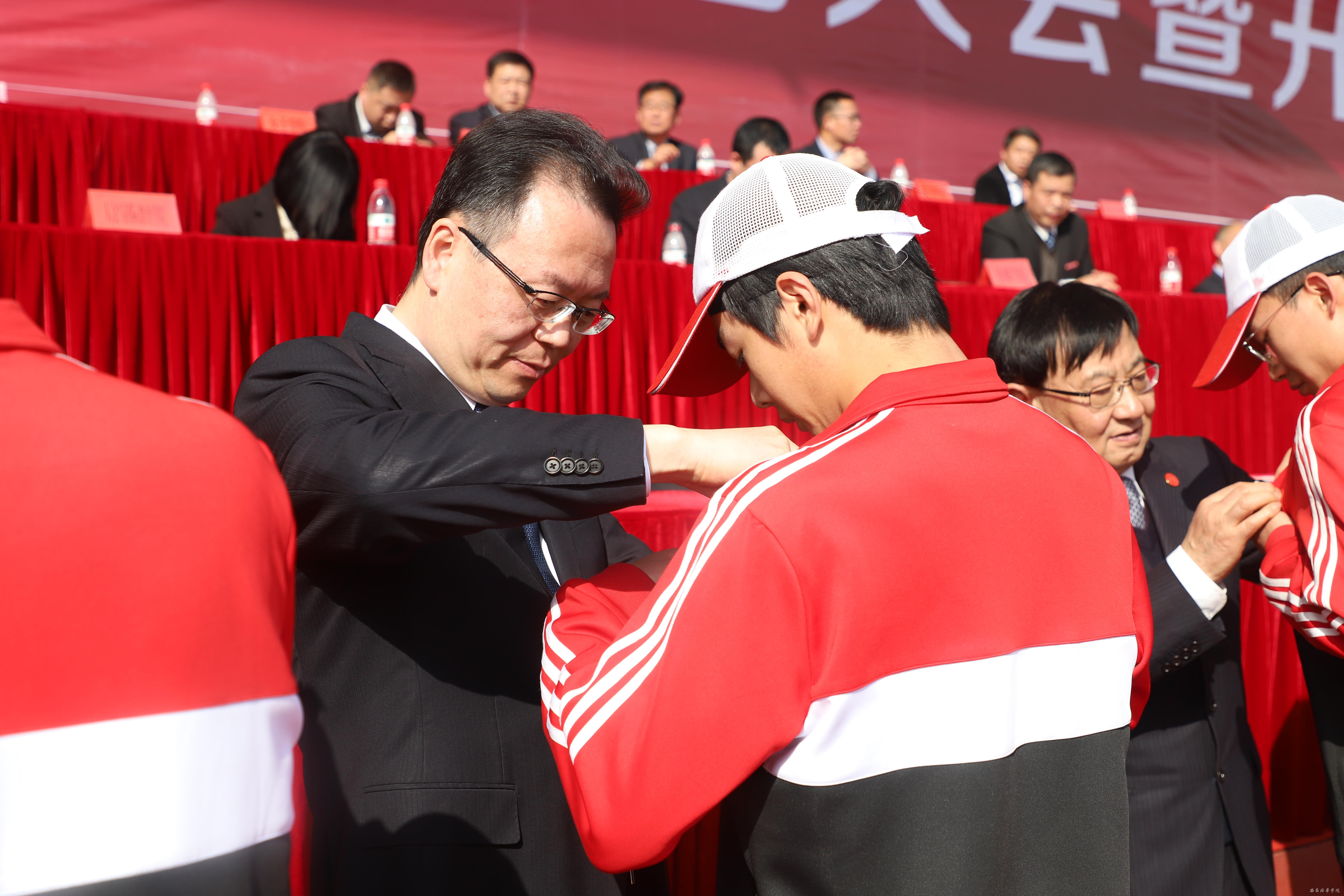 姜波理事长为新生奖学获奖代表金佩戴校徽