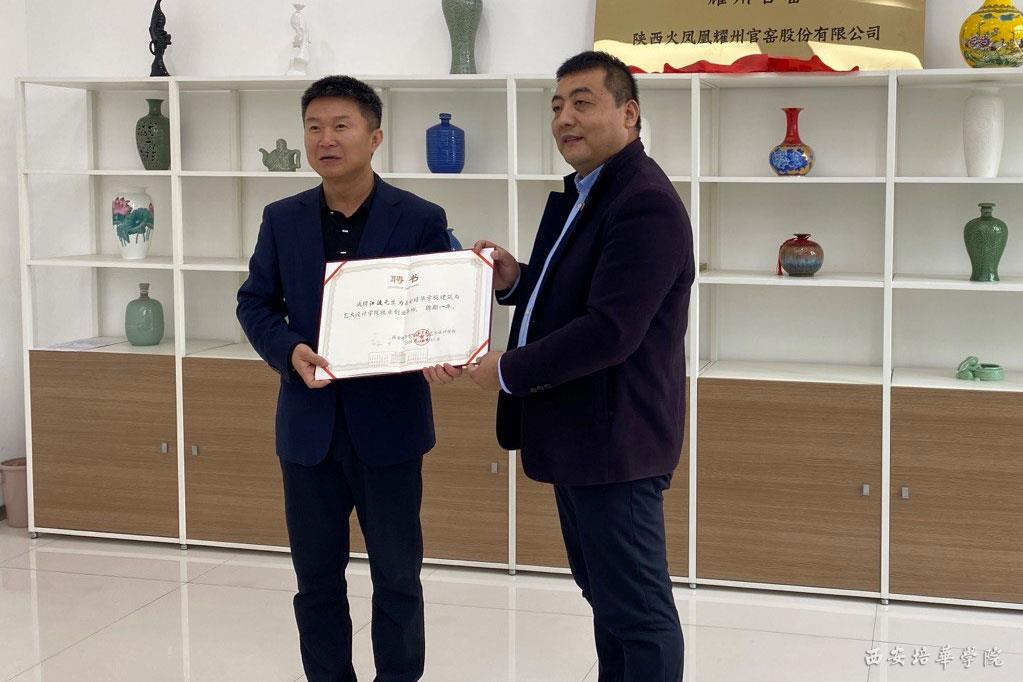 为提升建筑与艺术设计学院的学生实践能力,培养高素质专业性技术人才,在工艺美术专业带头人杨志教授的推荐与常务副院长徐莹的实地考察下,学校建筑与艺术设计学院与陕西火凤凰耀州官窑有限公司于2020年10月15日举办校企合作基地挂牌仪式,并在陕西省铜川市火凤凰耀州官窑有限公司隆重挂牌。