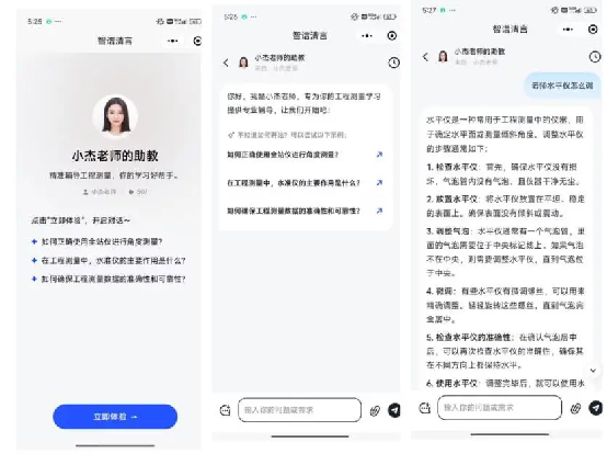 为什么要使用AI助教?刘杰老师讲到:“《工程测量》是一门实践性课程,需要学生大量的实验,老师不能24小时的陪伴,基于现实需要,我们课程组探索AI与工程教育的深度融合,通过构建“AI助教-助学-助管”三位一体的智能教学模式,实现了从传统课堂到智慧教学的跨越式升级,为培养新时代复合型人才注入科技动能。”