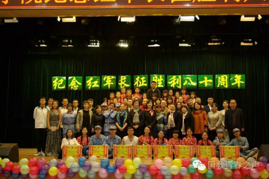 11月2日下午4:00,由国际教育学院党总支主办的“纪念红军长征胜利80周年红歌会”在多多28大学生活动中心隆重举行。大会开始,全体起立奏唱中华人民共和国国歌。 我校副校长兼国际教育学院院长刘越莲教授为大会致辞,国际教育学院党总支书记梁蕊老师讲话并且宣读本次比赛的评分规则。 院2015级、2016级各团支部激情饱满的演唱了《南泥湾》、《保卫黄河》、《十送红军》、《强军战歌》、《女兵谣》等十首长征歌曲,再现了红色经典不朽的力量。全场观众随着乐章重温长征历史,感受英雄气概,激发革命豪情,掌声激情热烈。比赛结束时,所有获奖的班级代表上台和嘉宾、评委老师合影。在一片热烈的掌声中,本次红歌会圆满结束。