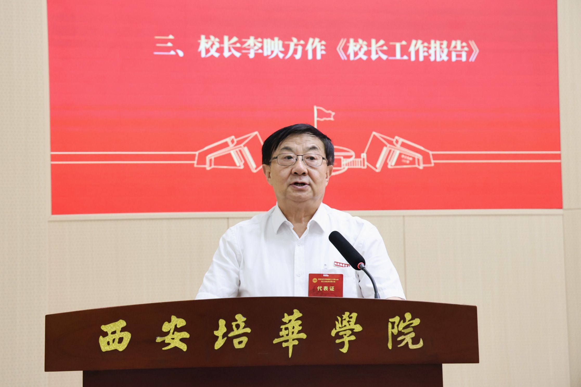 李映方代表学校行政班子向大会作了题为《锚定目标 狠抓落实 为建成高水平应用型大学而不懈奋斗》的校长工作报告。报告全面回顾和总结了三届一次“双代会”以来学校在党建政治引领、立德树人任务、高质量发展工程、师资队伍建设、教育教学改革、学科科研建设、基础设施提升、聚焦民生改善等方面取得的进展与成效,深入分析了当前面临的新形势、新挑战,并清晰阐述了下一阶段学校发展的总体思路、重点任务和战略举措,为学校未来发展描绘了清晰的蓝图。