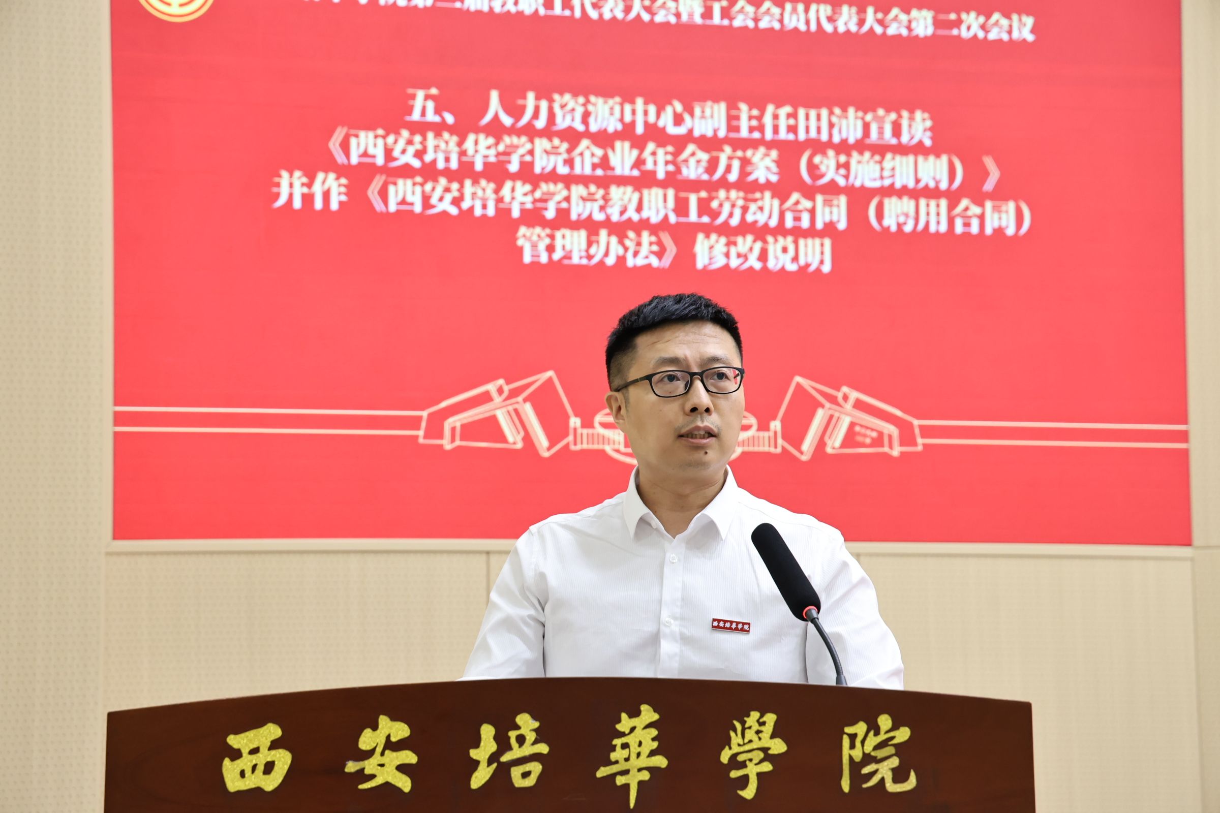 人力资源中心副主任田沛宣读《多多28企业年金方案(实施细则)》并作《多多28教职工劳动合同(聘用合同)管理办法》修改说明