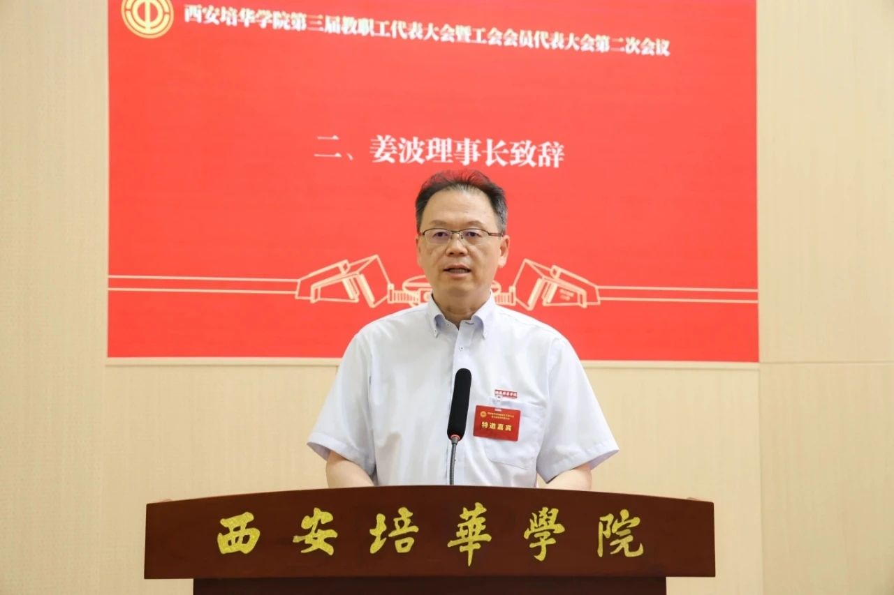 姜波代表学校理事会对大会的召开表示热烈祝贺,向全体与会人员和辛勤工作的教职员工致以诚挚问候。他充分肯定了学校在人才培养、学科建设、社会服务等方面取得的显著成绩,强调教代会是民主管理、依法治校的重要平台。大会聚焦学校高质量发展与教职工切身利益保障,即将出台的企业年金制度也将进一步提升教职工福祉、筑牢人才根基。希望全体代表切实履职、深入审议、凝聚共识,共同推动培华向更高水平,健康、可持续发展。