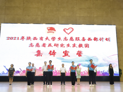 在仪式上,省教育厅副厅长高岭为2021年陕西省大学生志愿服务西部计划陕西服务总队授旗;与会领导共同为2020-2021年度西部计划先进集体和先进个人颁奖、为2021年陕西省大学生志愿服务西部计划研究生支教团,各市、县(区)服务分队授旗。