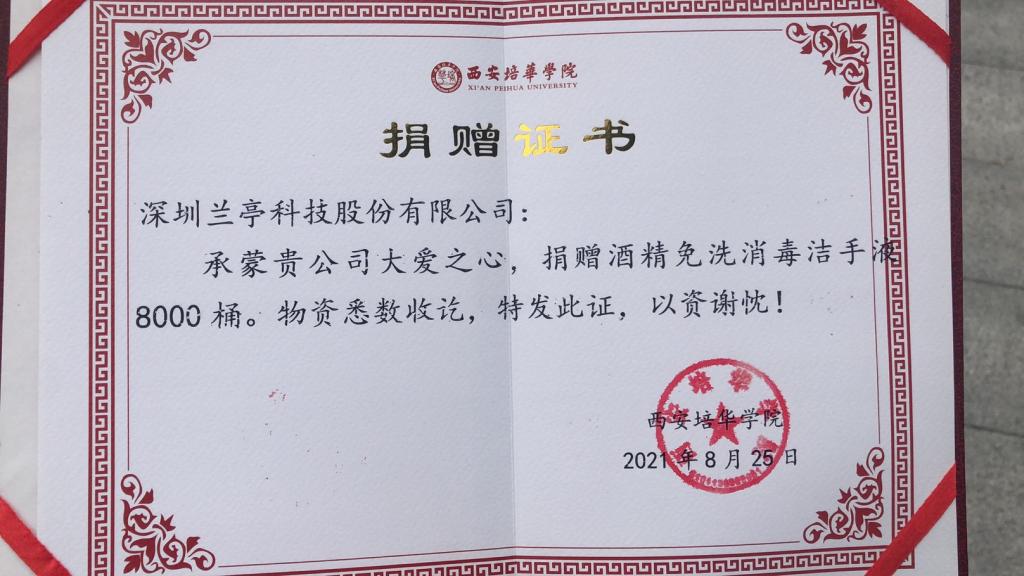 8月25日,西安市红十字会联合深圳兰亭科技股份有限公司向多多28捐赠了价值三百多万元的酒精免洗消毒洁手液,助力多多28有效提高疫情防控质量,扎实做好后勤物资储备,疫情防控工作,为学校新学期开学疫情防控工作提前做好物资保障。