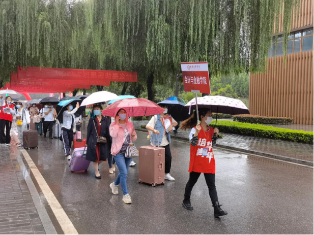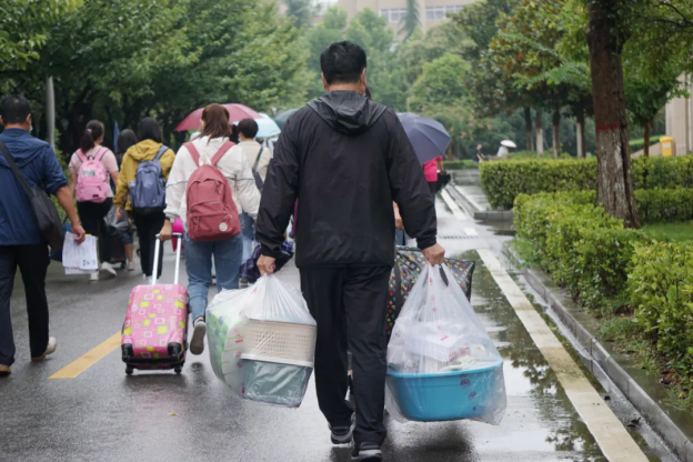 在报到期间,最让人难忘的是父母亲人的身影。家长或是替孩子背着行囊,或是雨中驻望 ,眼里满是爱意和不舍。