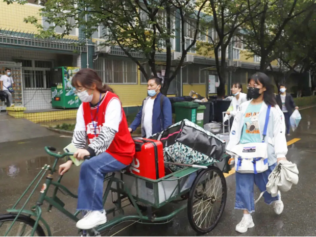 他们不怕吃苦,尽全力把行李帮新生运送到宿舍,在雨中奔波为新生搬行李的他们,就是这雨天中的一把伞。