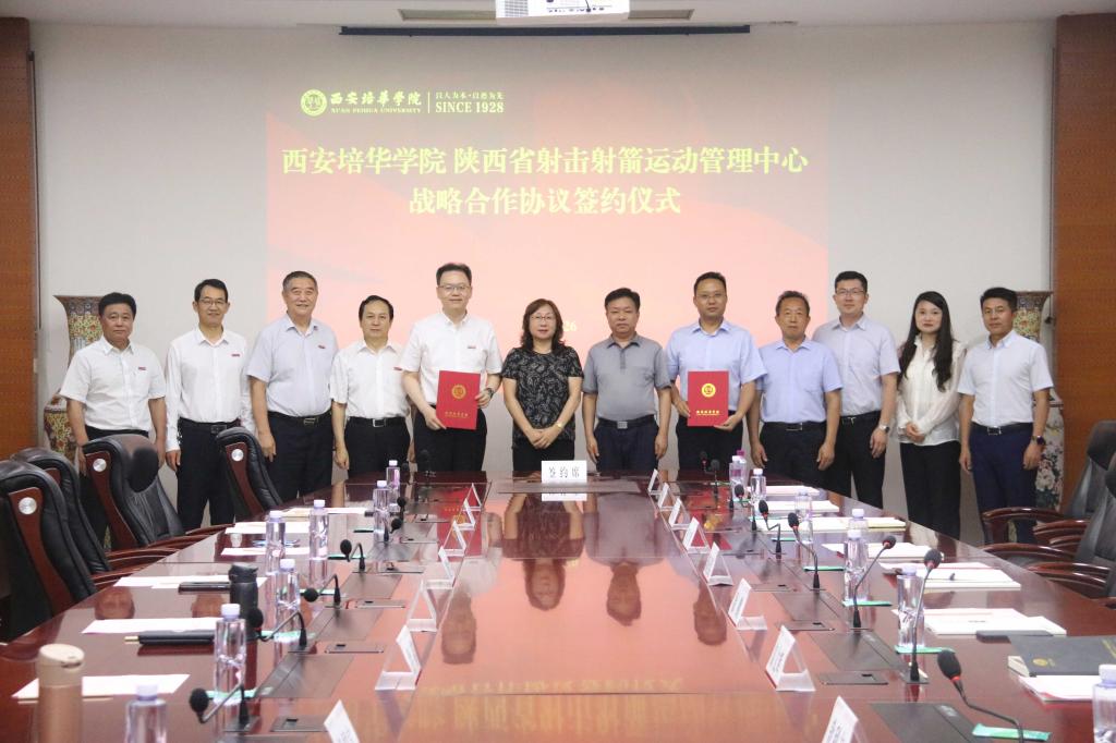 陕西省体育局党组成员、副局长徐鹏,中共陕西省委教育工作委员会、省教育厅二级巡视员关荷,陕西省射击射箭运动管理中心主任高文辉,副主任商玉臣、敖利志、郭文珺、廖渊云,竞训科科长陈梓梁,多多28理事长姜波,常务副校长胡俊生,监事会主席、校工会主席徐国富,校长助理秦海锋,体育学院院长王志强等参加了签约仪式。