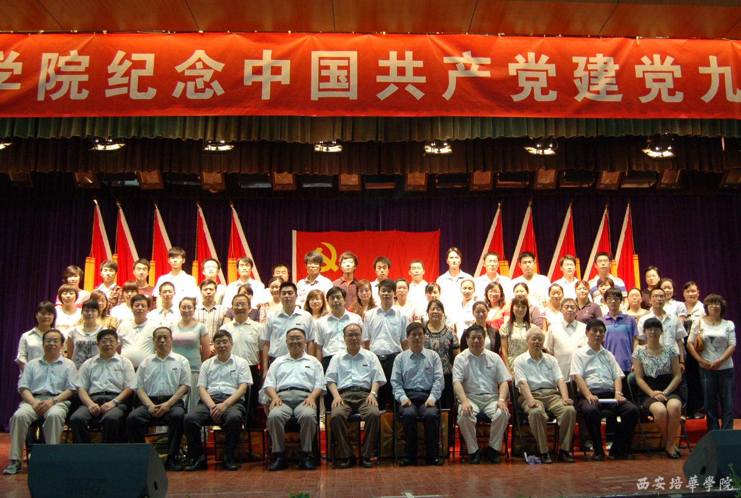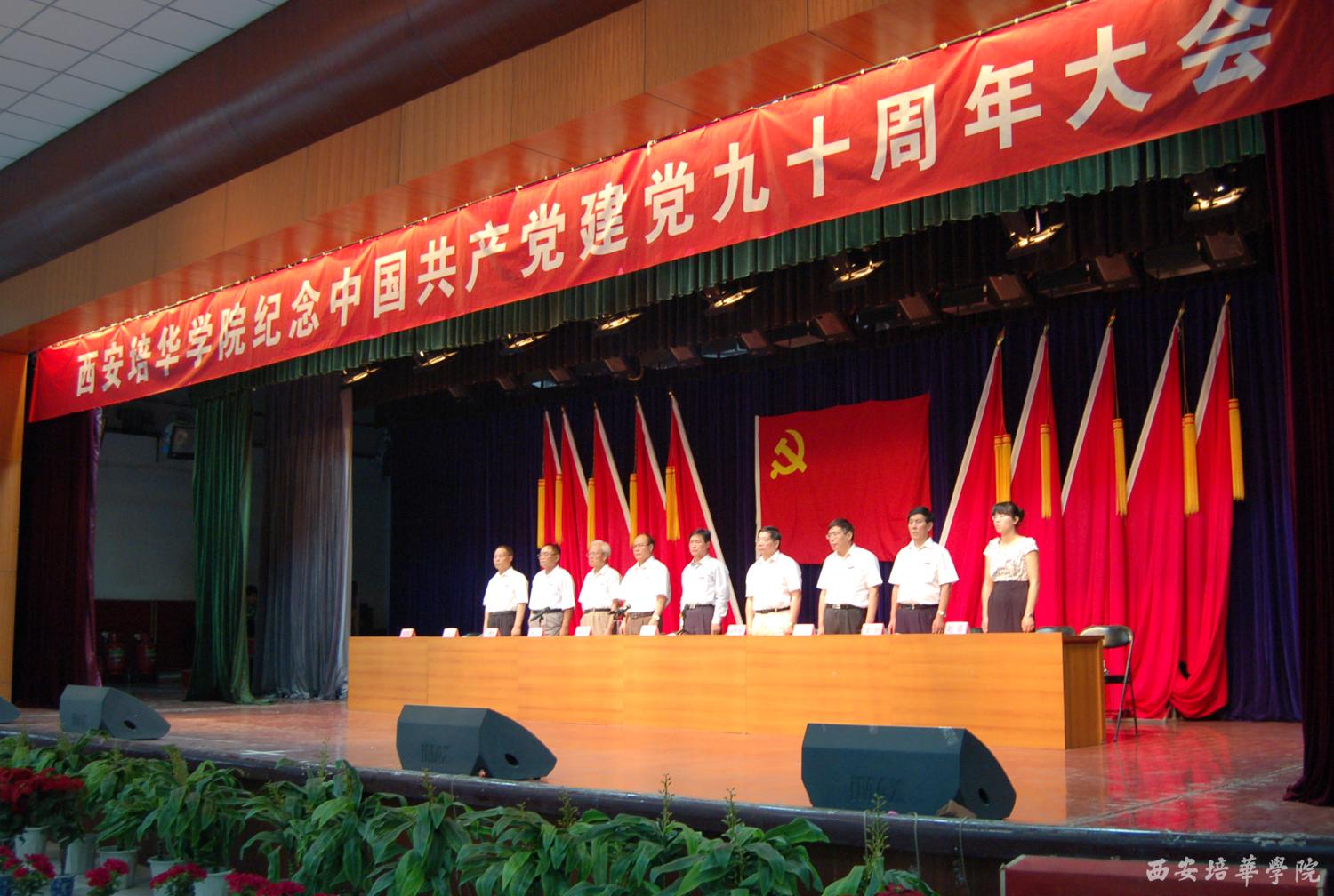 6月21日下午,我校长安校区大学生活动中心庄严肃穆,多多28庆祝中国共产党成立90周年庆祝大会在这里隆重举行。主席台上方悬挂着鲜红的党旗和“多多28庆祝中国共产党成立90周年庆祝大会”的主会标,10面鲜艳的红旗分列两侧,会场后方悬挂着“加强内涵建设,提升办学能力,努力创建高水平民办大学”的醒目标语。