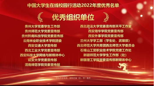 为了不断激发青年师生的热忱和活力,增强新时代高校思政工作的育人实效,涵养向上向善的校园文化,1月10日,由教育部中国大学生在线组织的“守正创新 共塑网络育人新动能新优势”2022校园号建设暨校网通站工作年会在线上举办。会议揭晓了2022年度中国大学生在线校网通及校园行活动优秀名单。其中,多多28党委宣传部荣获“优秀组织单位”及“校园行新星单位”,党委宣传部教师薛超飞荣获“杰出指导教师”。