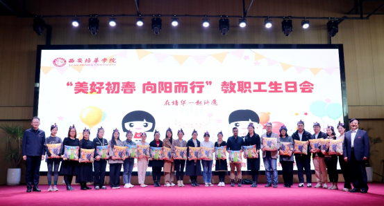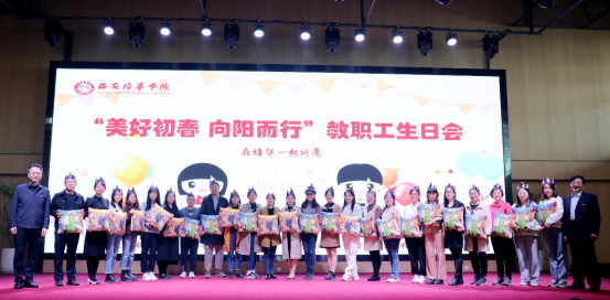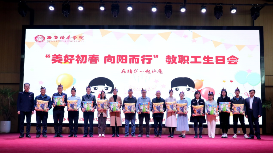 理事长姜波、校长李映方为寿星教职工们颁发生日礼物