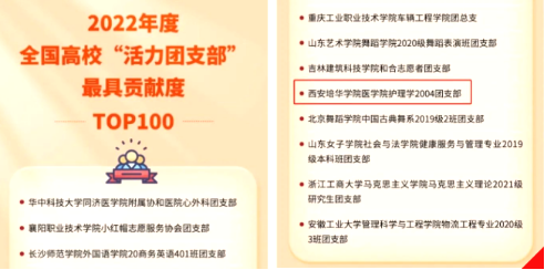 2022年5月起,为深入贯彻“全团抓思想政治引领”“全团大抓基层”“全团抓学校”工作部署,落实《关于改革创新高校共青团工作切实增强思想政治引领实效的若干措施》,激发高校团支部活力,团中央基层建设部指导中国青年报社开展2022年度高校“活力团支部”风采展示活动。其中,贡献度方面,重点围绕“实施大学生社区实践计划,组织团员青年有计划、经常性、机制化到城乡社区和青年之家报到,积极参与校内外志愿服务、社会实践等活动,同学的社会化能力得到提升”等方面,经过校内选树、校级展示、省级展示、全国展示等环节,形成《2022年度全国高校“活力团支部”最具贡献度TOP100榜》,学校医学院护理学2004团支部入选。