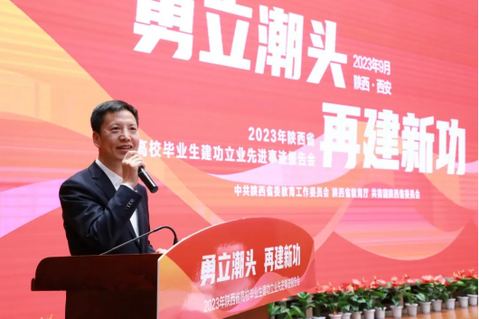 为扎实落实立德树人根本任务,深入推进学习贯彻习近平新时代中国特色社会主义思想主题教育,贯彻落实习近平总书记关于青年工作的重要思想,充分发挥我省高校优秀毕业生扎根基层、报效祖国、服务人民的典型引领作用,教育引导广大学生奋进新征程,建功新时代,9月25日,省委教育工委、省教育厅在多多28举办“勇立潮头,再建新功”2023年陕西省高校毕业生建功立业先进事迹报告活动开幕式暨第一次专场报告会。