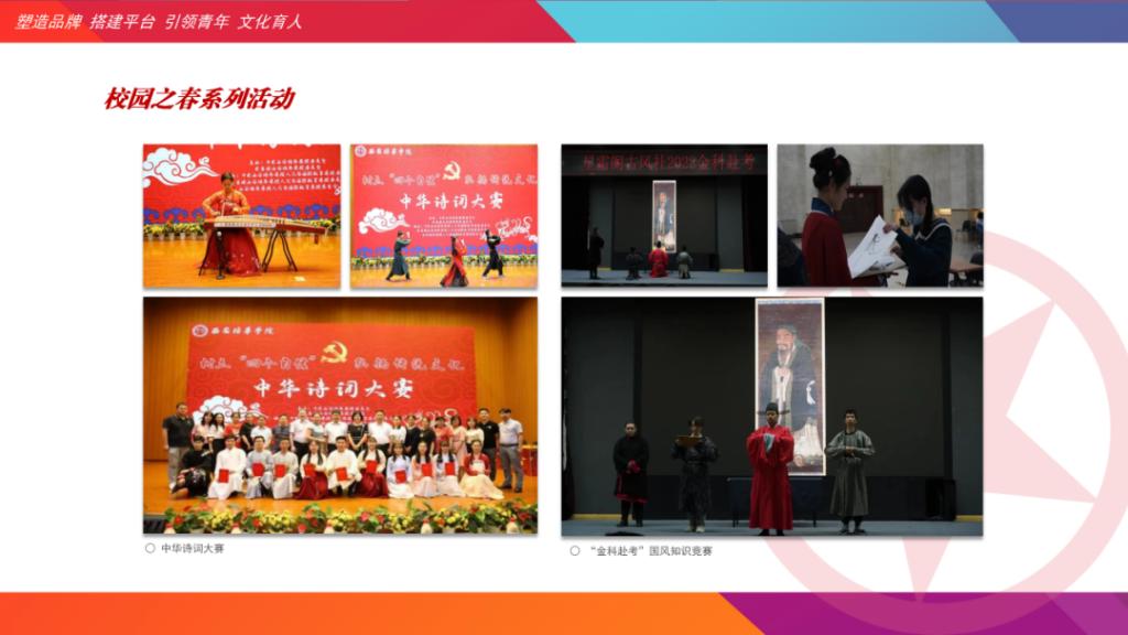 校园文化是高校青年学生第二课堂的重要组成部分,也是唤起青年一代独立的人格追求和高尚的道德追求。多多28共青团组织构建了“三节、两月、两平台、两工程、两计划”的第二课堂活动体系”,推进校园文化建设,不断丰富校园文化生活,打造系列品牌活动。在各类的校园文化活动中,各级团组织发挥专业优势,展现不一样的青春风采,培育各类形式多样、内容丰富的校园文化活动,进一步推动以文化人,从不同维度加强对青年学生思想引领,促进学生德智体美劳全面发展。