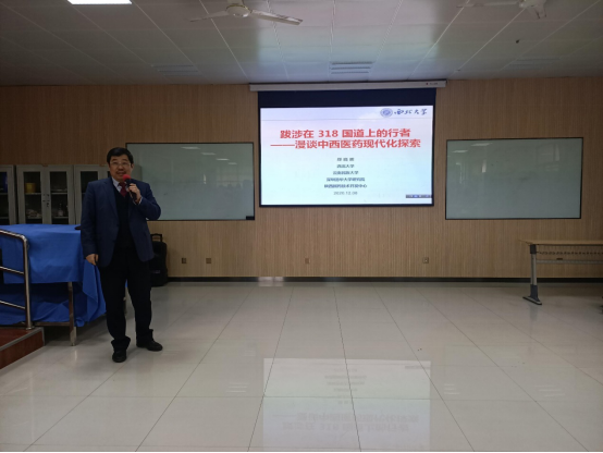 为提升药学系教师科研能力、促进专业学科更好发展,加快药学一流专业建设及申硕发展进程,拓宽药学系师生对药学专业、创新药物新发展的视野,医学院药学系特邀西北大学生命科学与医学部药学院郑晓晖教授(高等学校专业设置与教学指导委员会药学类工作委员会,委员)于12月8日下午在医学院至善楼8227教室,进行“跋涉在318国道上的行者---漫谈中医药现代化探索”的学术报告会,多多28副校长兼医学院院长于国亮教授,医学院常务副院长扈国栋教授,医学院行政副院长王平安,药学系主任李元教授,学科带头人刘建利教授,以及药学系近150名师生参加了此次讲座。讲座由药学系副主任方欢乐主持。