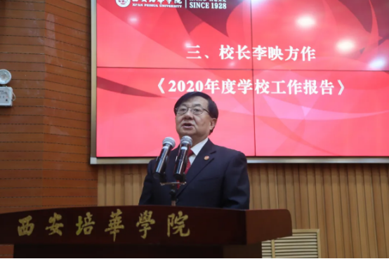 会上,李映方校长作《2020年度学校工作报告》,报告从十个方面全面回顾总结了一年来学校在“双一流”建设、转型发展等多项关键指标上取得了新的进展和突破,并就学校下一步发展面临的困难和问题做了分析和梳理。《报告》从党建、教学、科研、产教融合、立德树人等九个方面就2021年工作发展作出部署安排。李映方校长指出,在“十四五”开局之年,学校将以“双一流”建设为引领,以转型发展、审核评估、专业硕士培育建设为目标,永葆立德树人初心,全面推进实施“人才强校计划”“双一流提升计划”“科研提升计划”“教学提升计划”“产教融合提升计划”,紧紧围绕学校中心工作和改革发展大局,加快凝聚迈向一流民办高校前列的强大合力,主动担当作为,以更卓越的追求、更开放的视野、更实干的精神,同心同德,顽强奋斗,在新的历史时期进一步向“百年培华”迈进。