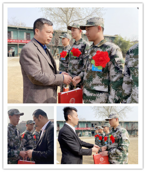 传媒学院党委书记、行政副院长江俊瑞,建筑与艺术设计学院党委书记、行政副院长权勇太,智能科学与信息工程学院党总支书记、行政副院长南兵为各自学院的新兵送上入伍纪念品。