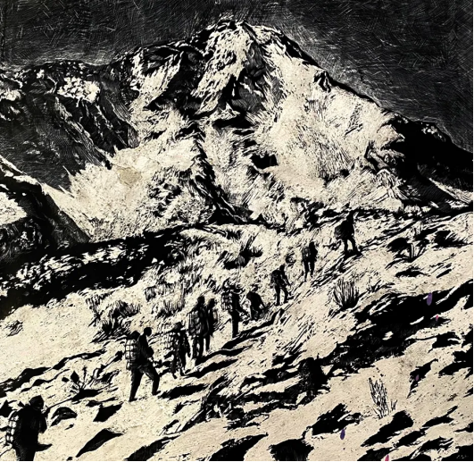 这张画是以建党100周年为主题,描述的是100年前红军在第五次反围剿失败后,长征时的场景,画面中展现了他们踏过雪山穿过草坪的景象。在寒风呼啸的雪山里他们艰难的踏着沉重的步伐,他们绝不会放弃,他们不会倒下,因为他们身上背负的不仅仅是自己的使命,更是国家的生命,人民的生命。