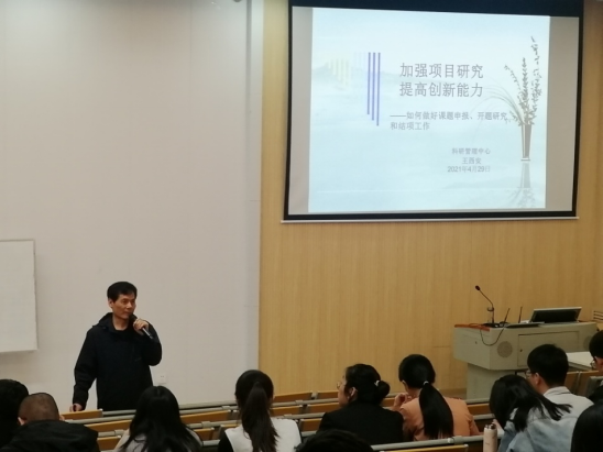 4月29日下午,科研管理中心主任王西安老师为新入职教职工做了题为“以课题研究为抓手,全面提升科研创新能力”的讲座。他分别从不同等级课题申报的步骤方法、课题的开结题报告、研究方案及报告的撰写方法等方面介绍了科研项目进行的整体流程。最后,他还叙述了科研成果奖申报的方式方法,使新入职教职工们对于科研项目的进程有了整体性认识。