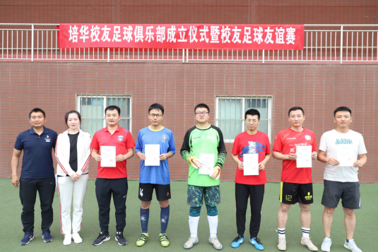 为更好的迎接十四运,传承培华优良传统,5月22日下午,由校友服务与发展中心联合体育学院共同举办的培华校友足球俱乐部成立仪式暨校友足球友谊赛在学校长安校区体育场举行。学校校友总会负责人王慰、体育学院公共教学部部长刘毅、体育学院足球俱乐部主任杜峰及40多位校友代表参加了成立仪式。