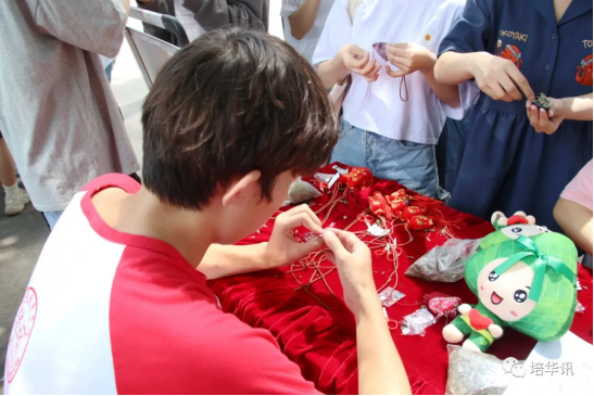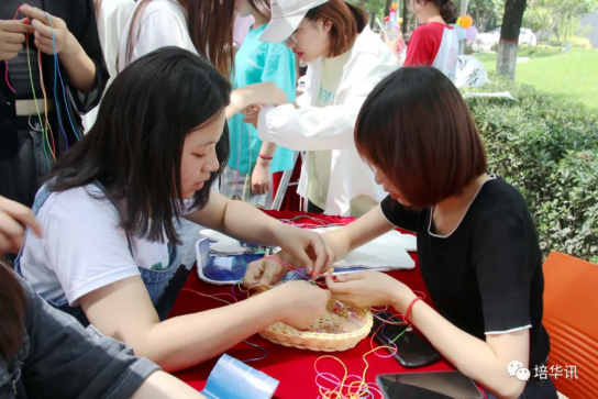 中国古代崇拜五色,以五色为吉祥色,寓意着祈福纳吉辟邪。活动现场,同学们用五彩线编制着一条条漂亮又精致的手链。