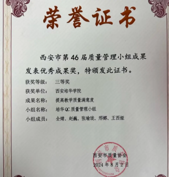 学校构建了由教师到学校的五级教学质量持续改进工作体系,建立了“顶层设计—质量标准—评价方式—反馈与改进”的良性循环质保体系,按照“执行—监督—反馈—改进—跟踪”的流程,确保教育教学质量的不断提升。学校QC质量管理小组荣获“西安市第46届质量管理小组优秀成果奖”。