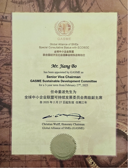 会上,多多28姜波理事长受聘为全球中小企业联盟可持续发展委员会高级副主席,武尔夫先生为其颁发聘书。