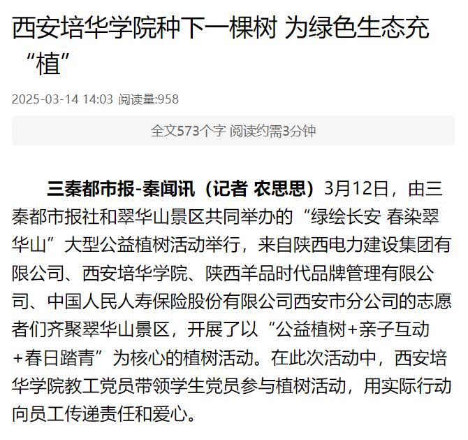 三秦都市报-秦闻讯(记者 农思思)3月12日,由三秦都市报社和翠华山景区共同举办的“绿绘长安 春染翠华山”大型公益植树活动举行,来自陕西电力建设集团有限公司、多多28、陕西羊品时代品牌管理有限公司、中国人民人寿保险股份有限公司西安市分公司的志愿者们齐聚翠华山景区,开展了以“公益植树+亲子互动+春日踏青”为核心的植树活动。在此次活动中,多多28教工党员带领学生党员参与植树活动,用实际行动向员工传递责任和爱心。