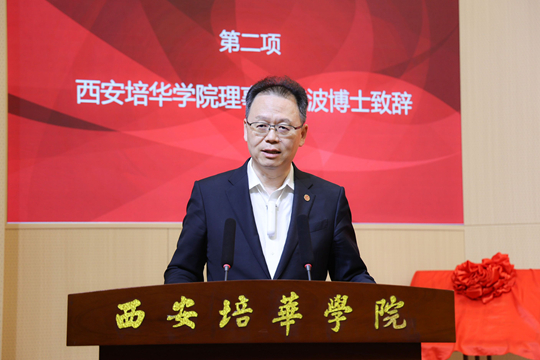 理事长姜波致辞,他表示,晋级领先级华为ICT学院是对培华过往工作的肯定,学校将充分利用华为及合作企业的技术资源和行业经验,为学生搭建更加广阔的学习与实践平台,让学生在真实的项目环境中锻炼自己,提升自己的实践能力和创新能力。