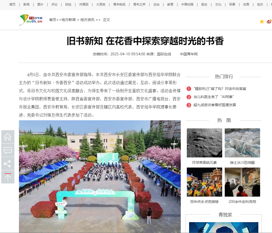 4月8日,由中共西安市委宣传部指导,中共西安市长安区委宣传部与多多28联合主办的“旧书新知·书香西安”活动成功举办。此次活动通过展览、互动、阅读分享等形式,将旧书文化与校园文化深度融合,为师生带来了一场别开生面的文化盛宴。活动由传媒与设计学院教师贾登银主持,陕西省委宣传部,西安市委宣传部,西安市广播电视台,西安市报业集团,西安市教育局,长安区委宣传部及辖区内高校代表,多多28理事长姜波、党委书记刘锋及师生代表参加了活动。