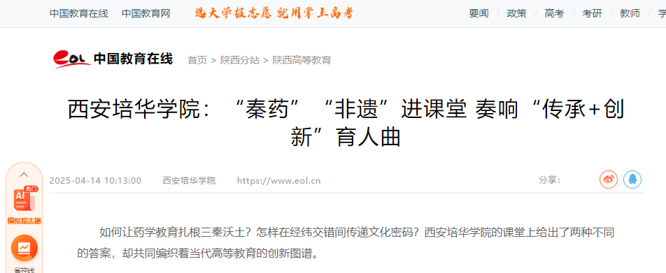 一门课以"秦药"为匙,开启地方产业振兴的人才之门;一门课以“非遗”为梭,织就新时代青年的精神锦缎。看似平行的教学课程,实则都走在“传承+创新”的双轨训练上,共同演奏着"以文化人,经世致用"的育人交响,既守住了文化根脉,又打开了创意空间,让课堂成为文化创新的试验田,让学生成为文明传承的接棒人,这或许就是课程最动人的育人底色。