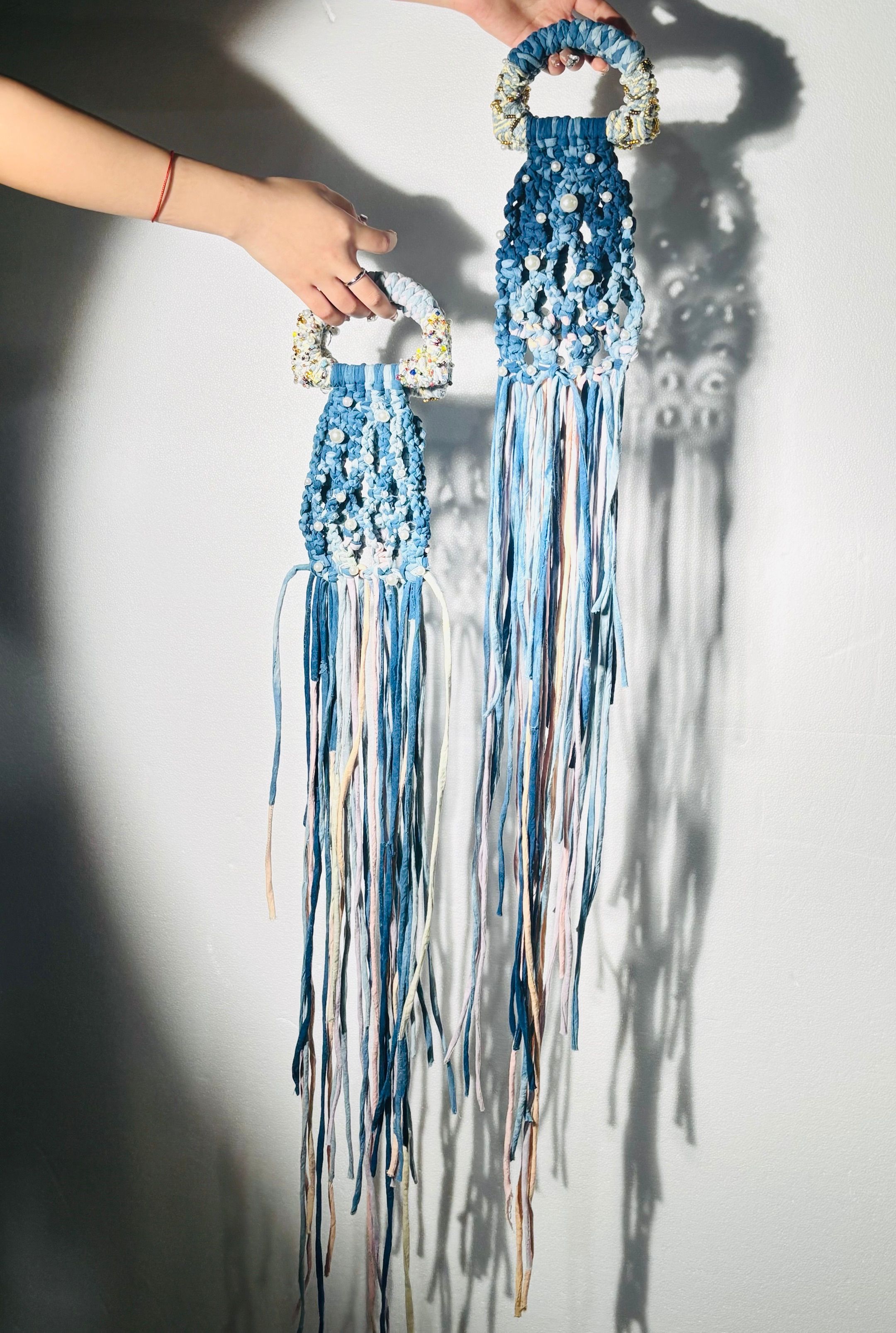 染缸前围满了好奇的身影,学生们轮流用木桨搅动靛蓝溶液,看沉淀的颜料在水波中翻涌成流动的星空,布料浸入时腾起的那缕青烟,恍惚间竟与《天工开物》里的匠人身影重叠,学生董淇良特意将染好的蓝布举到窗前,阳光穿透布料上的云纹扎痕,在地面投下斑驳的光影。“原来古人的扎染,是把天空和云彩都缝进了布里”。课程特别注重“做中学”的教学理念,通过校企合作对接文创产业需求,让学生在真实的市场语境中检验设计方案,他们在解决真实设计问题的过程中,既掌握了手工工艺的核心技能,又培养了跨学科创新能力。实现对“教、学、做合一”的践行,“用洋葱皮染出焦糖色围巾,石榴皮煮出复古红手帕,厨余垃圾秒变时尚单品,我感觉是在进行文明的接力。我在传统文化里表达出自己的语言了”服装与服饰设计专业2301班潘乐瑶说道。当被问及传统的扎染能吸引新时代的学生吗?牛菲副教授说道:"时代虽然在变,但审美的变化是缓慢的,尤其是经历过时间沉淀的中国传统文化,她蕴藏的造物智慧与自然美学,正在国潮复兴中演化出新的时代意义。当扎染纹样出现在潮牌卫衣上,当非遗工坊开设数字艺术课程,这种‘古老技艺的年轻化叙事’,就是传统与时代对话的最好证明"。
