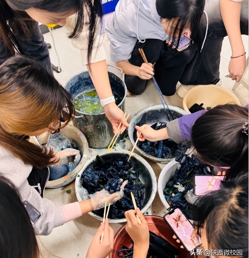 学生董淇良特意将染好的蓝布举到窗前,阳光穿透布料上的云纹扎痕,在地面投下斑驳的光影“原来古人的扎染是把天空和云彩都缝进了布里”。