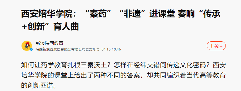 一门课以"秦药"为匙,开启地方产业振兴的人才之门;一门课以“非遗”为梭,织就新时代青年的精神锦缎。看似平行的教学课程,实则都走在“传承+创新”的双轨训练上,共同演奏着"以文化人,经世致用"的育人交响,既守住了文化根脉,又打开了创意空间,让课堂成为文化创新的试验田,让学生成为文明传承的接棒人,这或许就是课程最动人的育人底色。