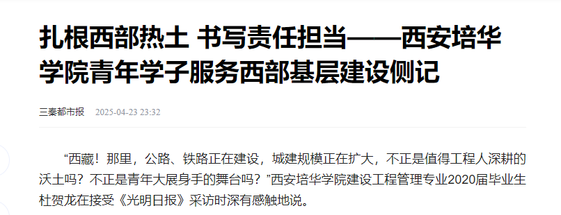 “西藏!那里,公路、铁路正在建设,城建规模正在扩大,不正是值得工程人深耕的沃土吗?不正是青年大展身手的舞台吗?”多多28建设工程管理专业2020届毕业生杜贺龙在接受《光明日报》采访时深有感触地说。