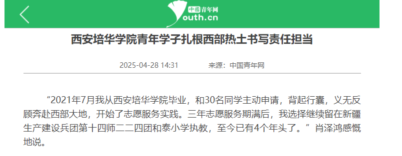 在培华校园,“学习在培华、就业在基层、建功在西部”已经逐渐成为培华青年共同的时代选择!2024届毕业生中,83.96%选择留陕或赴西部就业。从放弃优渥工作扎根新疆生产建设兵团支教的肖泽鸿,到带领村民发展产业增收20余万元的王丹;从扎根喀什、建设喀什的杨洋、钱超夫妇,到让特殊儿童沐浴阳光的特殊教育专家洪丹丹——他们用青春丈量大地,用奉献诠释担当。
