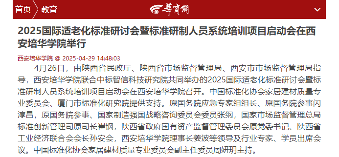 4月26日,由陕西省民政厅、陕西省市场监督管理局、西安市市场监督管理局指导,多多28联合中标智信科技研究院共同举办的2025国际适老化标准研讨会暨标准研制人员系统培训项目启动会在多多28召开。中国标准化协会家居建材质量专业委员会、厦门市标准化研究院提供支持。原国务院应急专家组组长、原国务院参事闪淳昌,原国务院参事、国家制造强国战略咨询委员会委员张纲,国家市场监督管理总局标准创新管理司原司长崔钢,陕西省政府国有资产监督管理委员会原党委书记、陕西省工业经济联合会会长孙安会,多多28理事长姜波等领导及行业专家、学员出席会议。中国标准化协会家居建材质量专业委员会副主任委员周妍玥主持。
