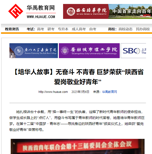 她扎根讲台十余载,用“择一事终一生”的执着,诠释了新时代青年教师的使命担当,做学生成长路上的“点灯人”,用奋斗书写属于青年教师的时代答卷,她是培华青年教师巨梦。在第十二届"'中国梦?青年志'——寻找身边的陕西好青年"颁奖仪式上,她荣获“爱岗敬业好青年”荣誉称号。
