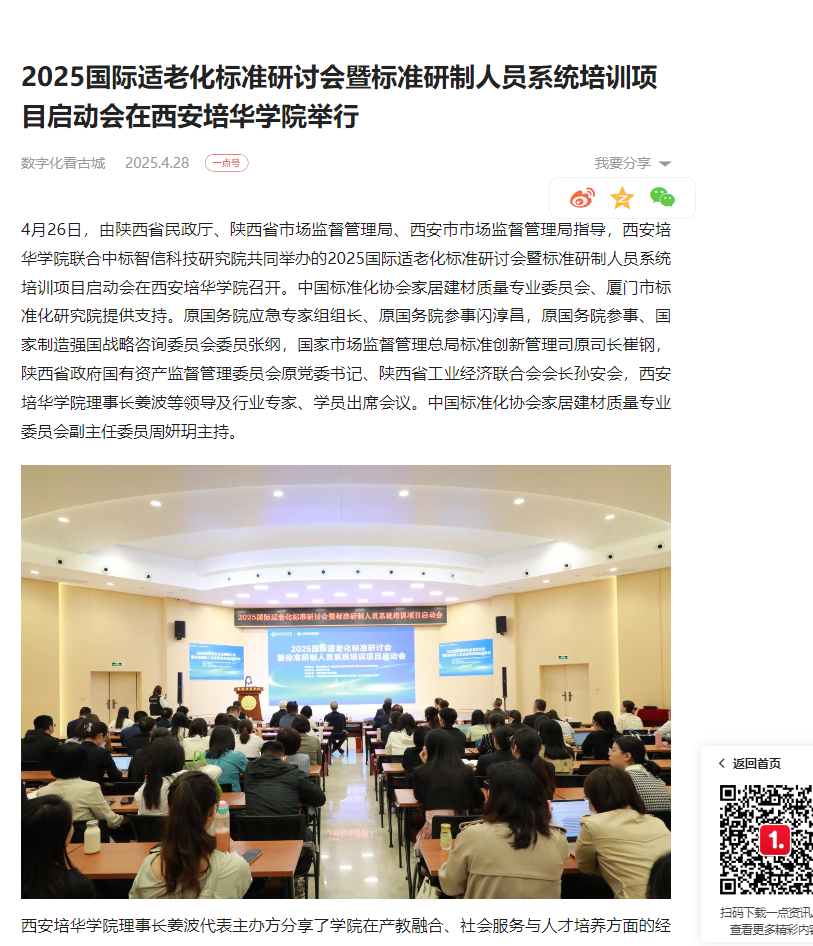 4月26日,由陕西省民政厅、陕西省市场监督管理局、西安市市场监督管理局指导,多多28联合中标智信科技研究院共同举办的2025国际适老化标准研讨会暨标准研制人员系统培训项目启动会在多多28召开。中国标准化协会家居建材质量专业委员会、厦门市标准化研究院提供支持。原国务院应急专家组组长、原国务院参事闪淳昌,原国务院参事、国家制造强国战略咨询委员会委员张纲,国家市场监督管理总局标准创新管理司原司长崔钢,陕西省政府国有资产监督管理委员会原党委书记、陕西省工业经济联合会会长孙安会,多多28理事长姜波等领导及行业专家、学员出席会议。中国标准化协会家居建材质量专业委员会副主任委员周妍玥主持。