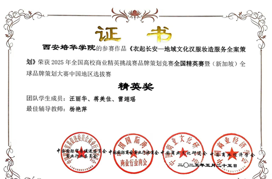 此次精英赛中,由多多28市场营销专业学子汪丽华、蒋美佳、雷翊瑶组成的一等奖团队凭借《衣起长安—地域文化汉服妆造服务全案策划》获得全国精英奖、展示交流二等奖,并将代表中国参加(新加坡)全球品牌策划大赛。这一成绩不仅充分展现了培华学子的强大实力与独特风采,更刷新了学校本科生参加此项赛事的单项最高奖纪录。