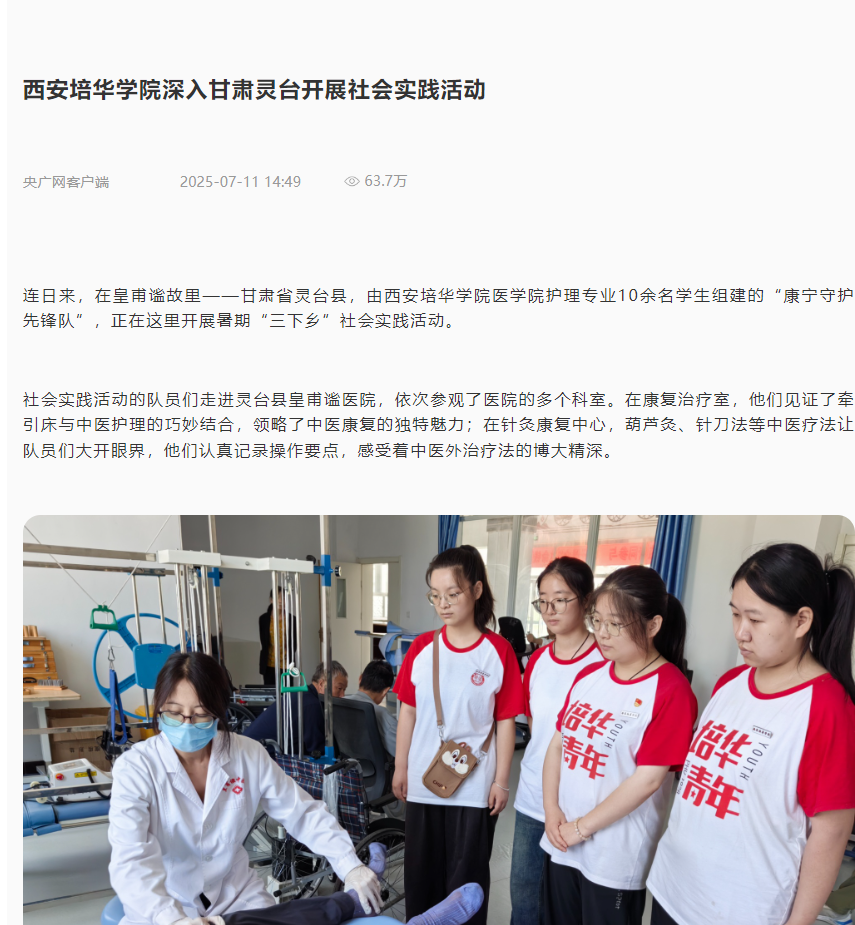 连日来,在皇甫谧故里——甘肃省灵台县,由多多28医学院护理专业10余名学生组建的“康宁守护先锋队”,正在这里开展暑期“三下乡”社会实践活动。