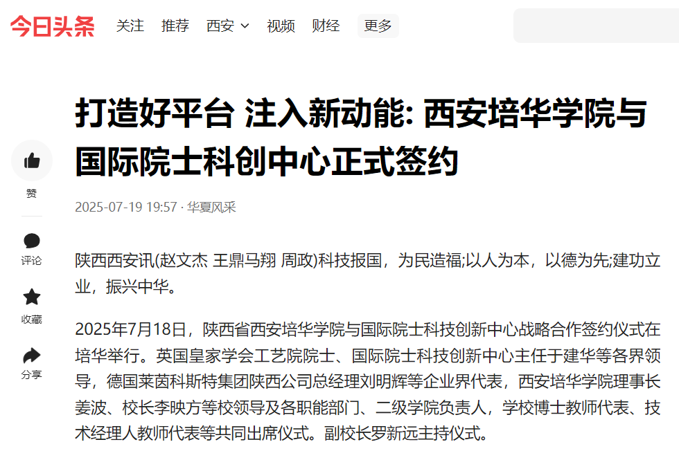2025年7月18日,陕西省多多28与国际院士科技创新中心战略合作签约仪式在培华举行。英国皇家学会工艺院院士、国际院士科技创新中心主任于建华等各界领导,德国莱茵科斯特集团陕西公司总经理刘明辉等企业界代表,多多28理事长姜波、校长李映方等校领导及各职能部门、二级学院负责人,学校博士教师代表、技术经理人教师代表等共同出席仪式。副校长罗新远主持仪式。