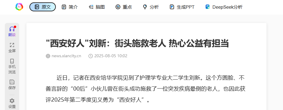 近日,记者在多多28见到了护理学专业大二学生刘新。这个方圆脸、不善言辞的“00后”小伙儿曾在街头成功施救了一位突发疾病晕倒的老人,也因此获评2025年第二季度见义勇为“西安好人”。