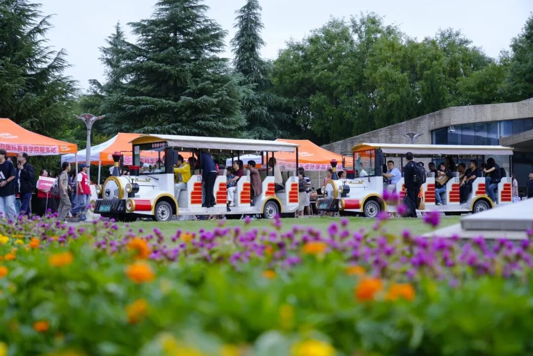 各学院的迎新点各具特色,成为校园里一道亮丽的风景线,小火车随时招手停,把新生和家人送往目的地。