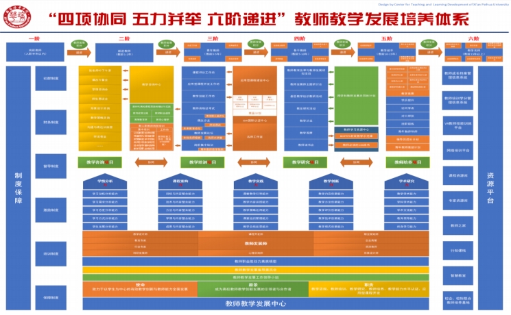 “四项协同 五力并举 六阶递进”教师教学发展培养体系是学校教师教学发展中心经过多年的实践研究所得,在教师教学发展工作领导小组和教师教学发展指导委员会的带领下,以教师职业胜任力素质模型为基础,致力于以学生为中心的有效教学创新与教师能力全面发展,以教学咨询、教师培训、教学研究、教师培养、教学能力水平认证、应用型课程开发为职责,以制度为保障,以资源为平台,通过教师发展师团队的引领,优化完善教师管理服务体系,全力支持青年教师成长,培育学校教育教学生力军。