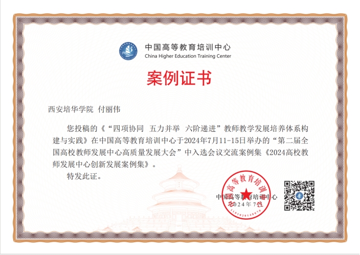 2024年7月,由中国高等教育学会指导,中国高等教育培训中心主办的“第二届全国高校教师发展中心高质量发展大会”在吉林长春成功举办。在会议开展的高校教师发展中心创新发展案例征集活动中,学校提交的案例“多多28“四项协同 五力并举 六阶递进”教师教学发展培养体系构建与实践”入选《2024高校教师发展中心创新发展案例集》(简称《案例集》)。